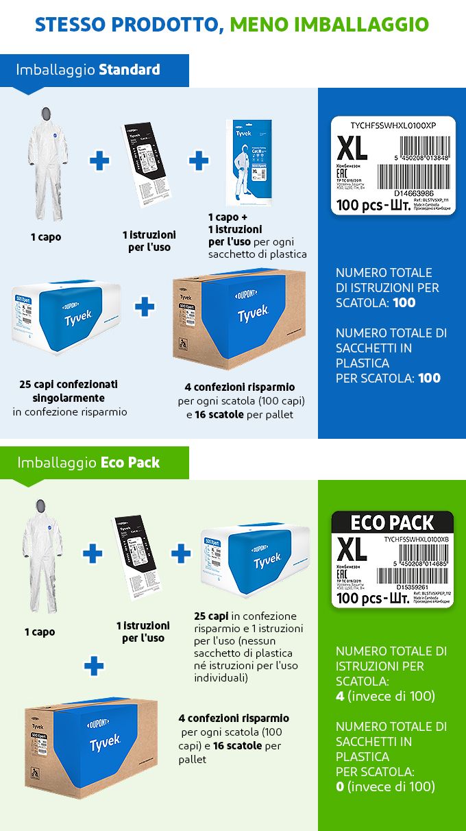 Nella sua forma di imballaggio standard, ogni indumento Tyvek® 500 Xpert è confezionato singolarmente in un sacchetto di plastica insieme a un manuale utente (denominato Istruzioni per l'uso). 25 tute da lavoro vengono quindi raggruppate all'interno di una confezione risparmio e ogni scatola contiene 4 confezioni risparmio, il che significa 100 capi per scatola. “Come parte del concetto di imballaggio Eco per tute Tyvek® 500 Xpert di DuPont, i 25 capi della confezione risparmio non sono più confezionati singolarmente e ciascuna confezione risparmio contiene soltanto un manuale utente. Quindi il risparmio sugli imballaggi equivale al 100 percento in termini di sacchetti di plastica e al 96 percento nelle istruzioni per l'uso", spiega Andrzej Pałka, Marketing Manager EMEA, DuPont Personal Protection.