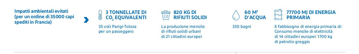 Per la valutazione sono stati presi in considerazione tre scenari separati, diversi in termini di numero di capi spediti, distanza di spedizione e scenario di fine vita (discarica, incenerimento o riciclo, a seconda della pratica di gestione dei rifiuti del paese di destinazione). Sulla base di una quantità di spedizione di 35.000 tute trasportate su camion in Francia (scenario B), sono stati previsti i seguenti vantaggi dell'imballaggio Eco per Tyvek® 500 Xpert rispetto all'imballaggio standard:
