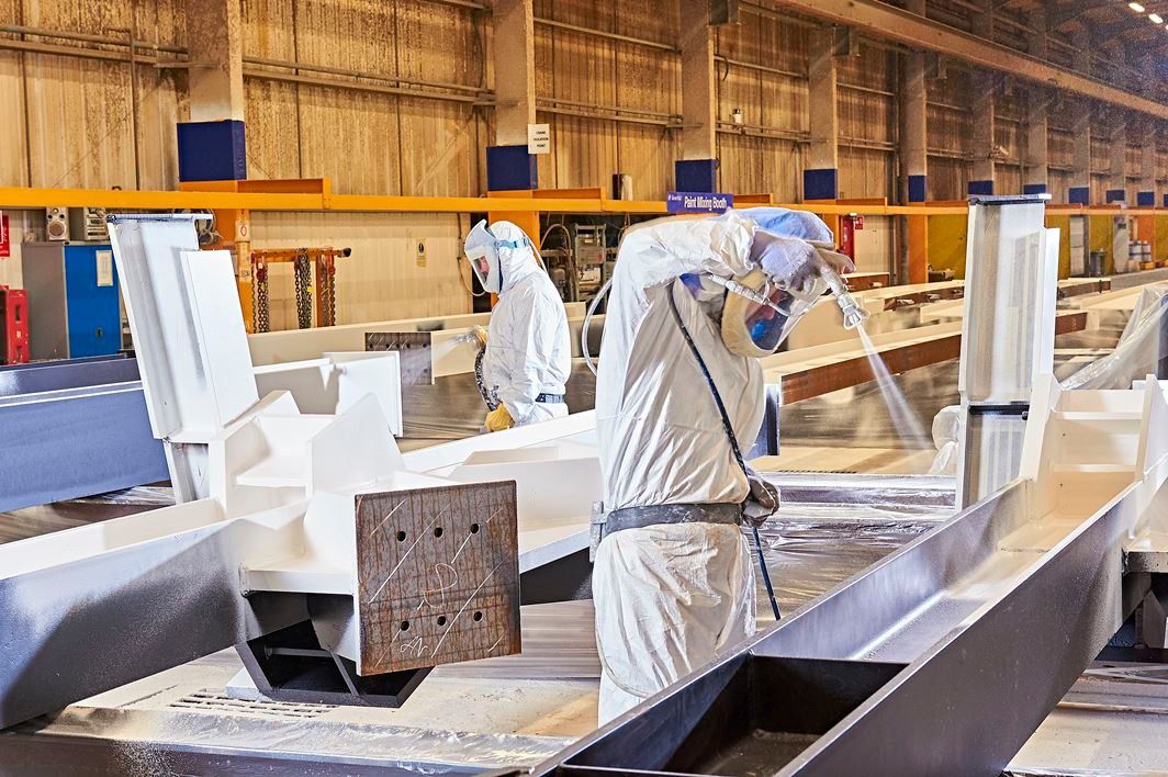 All’inizio del processo produttivo, grandi sezioni d’acciaio non trattato che pesano fino a 24 tonnellate vengono inserite in una delle dieci linee di produzione per essere tagliate, sabbiate, rivestite e infine tinteggiate e verniciate. Le operazioni di tinteggiatura e verniciatura vengono eseguite alla fine del processo produttivo, prima che il componente in acciaio sia trasportato nel cantiere edile. Spesso il tempo per la produzione è limitato e viene richiesto che gli elementi in acciaio siano pronti per il cantiere in un tempo massimo di 48 ore. Per rispondere alle esigenze dei clienti, i lavoratori di Severfield devono effettuare turni lunghi: il turno dei lavoratori diurni è dalle 7 alle 17.30. Dopo un’ora e mezza di pausa segue il turno di notte di tinteggiatura e verniciatura a spruzzo, dalle 19 alle 7 del mattino successivo.